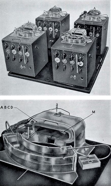 Рис. 91. Вверху: фотография гомеостата (четыре блока). Внизу: фотография отдельного блока. Буквами ABCD обозначена четверная обмотка электромагнита, буквой М — магнит