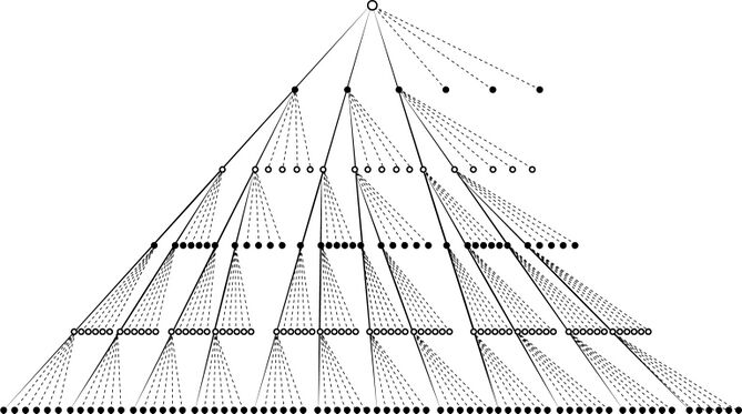 В своей работе Шеннон рассматривает возможность ограничения количества вариантов, анализируемых на каждом из уровней дерева перебора. Например, на картинке ниже изображено дерево с ограничениями числа рассматриваемых вариантов в 3, 2, 2, 1, 1 для глубины соответственно в 1, 2, 3, 4 и 5 полуходов. Сплошными линиями показаны «разрешённые» к рассмотрению ходы, штриховыми — «запрещённые».