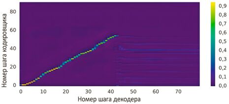 Поскольку данная модель основана на связке «кодировщик — декодер», то в процессе обучения наблюдается интересное явление — выстраивание так называемых выравниваний [alignment] для фраз в обучающей выборке. Выравнивание — это график, на котором по оси y отмечается номер шага кодировщика, по оси x — номер шага декодера, а цвет показывает накапливаемые веса внимания. Чем больше значения последних, тем больше декодеру «следует обратить внимание» на соответствующую часть данных кодировщика при генерировании очередного фрейма спектрограммы. Вначале графики выглядят неинформативно, но по мере обучения они начинают всё больше напоминать прямые отрезки, хотя для этого модель должна преодолеть несколько тысяч или даже десятков тысяч шагов обучения.
