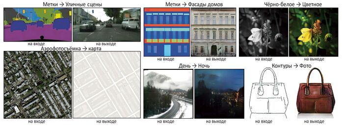 Идея обусловливания GAN’ов получила дальнейшее развитие в ряде других исследований. Например, в конце 2016 г. в работе «Трансляция изображений в изображения при помощи обусловленных состязательных сетей» (Image-to-Image Translation with Conditional Adversarial Networks)[5] была представлена популярная и в наши дни модель pix2pix. В этой модели в качестве обусловливающей информации при генерации изображения выступает другое изображение. Список задач, которые могут быть решены при помощи pix2pix, весьма обширен. Например, в задаче раскраски чёрно-белое изображение транслируется в цветное (т. е. в данном случае чёрно-белое изображение является обусловливающим изображением при генерации цветного). Таким путём спутниковые снимки могут превращаться в карты, дневные фотоснимки — в ночные (и наоборот), фотографии людей — в их же фотографии с удалённым фоном, наброски картинок, сделанные на скорую руку в редакторе типа Paint, — в законченные фотореалистичные изображения.