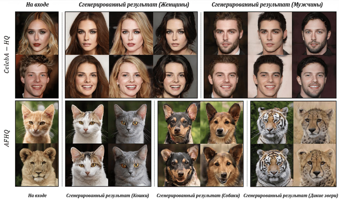 Вот пример работы модели (StarGAN v2) для трансляции изображений между доменами:
